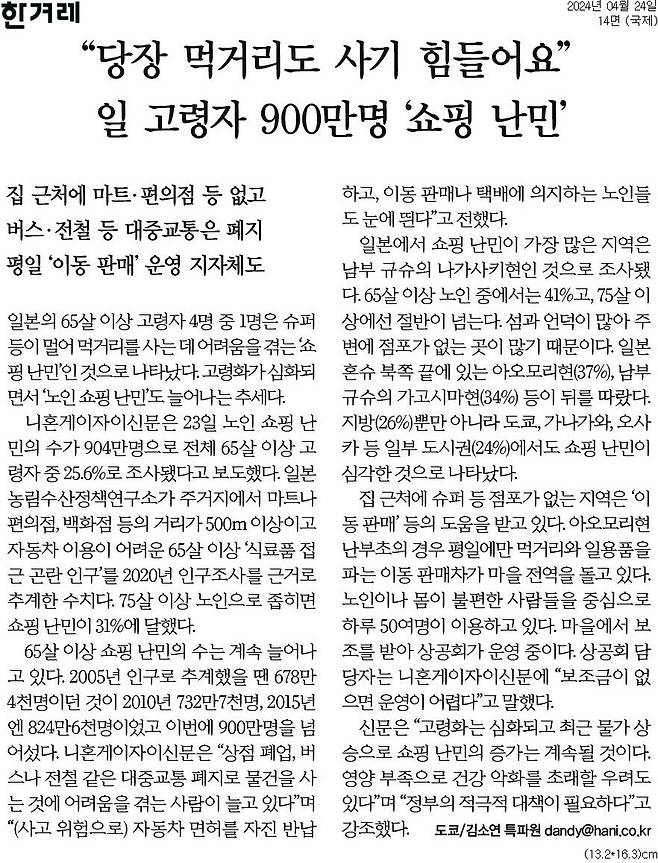 - 인구가 줄어들면, 대중교통 노선도 폐지됩니다. 노인들은 ‘쇼핑 난민’이 됩니다. 아직은 일본의 이야기입니다.