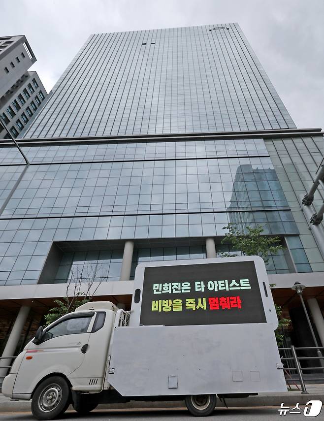 (서울=뉴스1) 장수영 기자 = 24일 서울 용산구 하이브 본사 앞에 뉴진스의 일부 팬들이 보낸 시위 트럭이 세워져 있다.