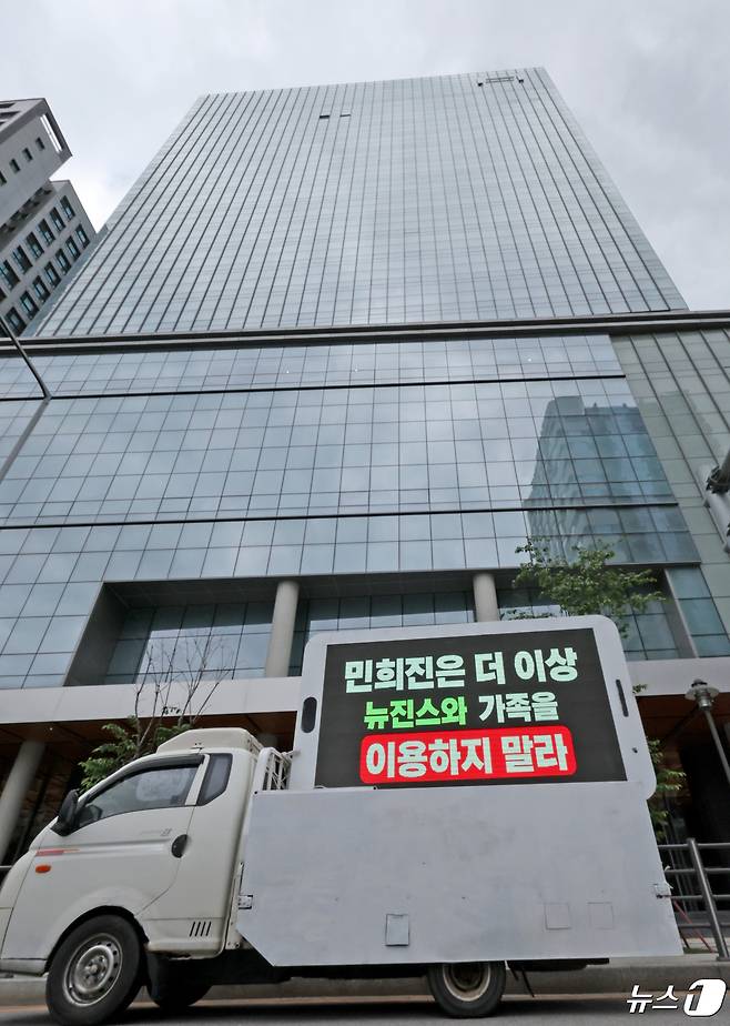 (서울=뉴스1) 장수영 기자 = 24일 서울 용산구 하이브 본사 앞에 뉴진스의 일부 팬들이 보낸 시위 트럭이 세워져 있다.