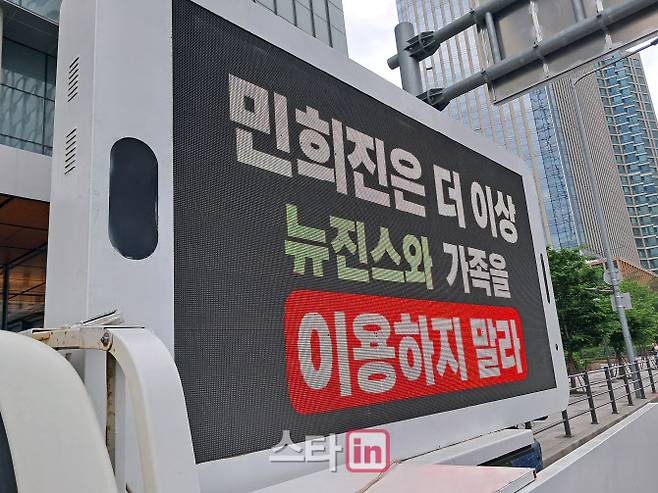 더불어 트럭 시위를 주도한 팬들은 '더이상 뉴진스와 가족을 이용하지 말라', '타 아티스트 비방을 즉시 멈춰라' 등의 메시지로 민 대표를 향해 목소리를 냈다.