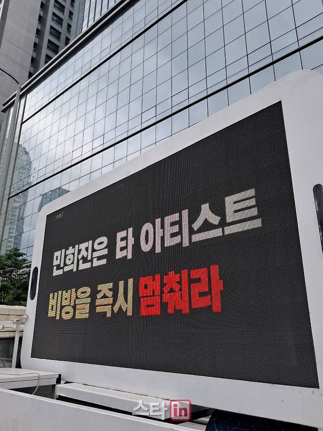 "민희진, 뉴진스 이용 말라"…용산 하이브 사옥 앞, 트럭 시위 벌어졌다