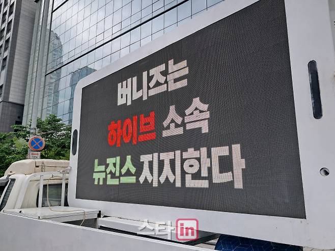 뉴진스의 일부 팬들은 24일 서울 용산구 하이브 사옥 앞에 시위용 트럭을 보냈다. 이를 통해 팬들은 ‘버니즈(공식 팬덤명)는 하이브 소속 뉴진스를 지지한다’는 입장을 밝혔다. 멤버들의 하이브 이탈을 원치 않는다는 의미다.