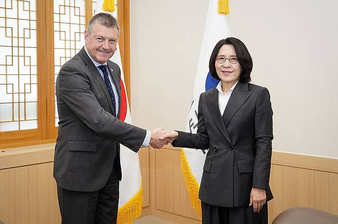 (서울=연합뉴스) 강인선 외교부 2차관이 24일 서울 종로구 외교부 청사에서 롭 스튜어트 캐나다 외교부 통상차관을 만나 악수하며 기념 촬영하고 있다. 2024.4.24 [외교부 제공. 재판매 및 DB 금지]