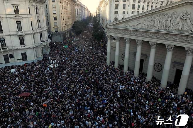 (부에노스 아이레스 AFP=뉴스1) 최종일 기자 = 23일(현지시간) 아르헨티나 부에노스 아이레스에서 정부의 공립 대학 지원 예산 삭감에 항의하는 대학생 수 만 명이 시위를 벌이고 있다. 2024.04.23