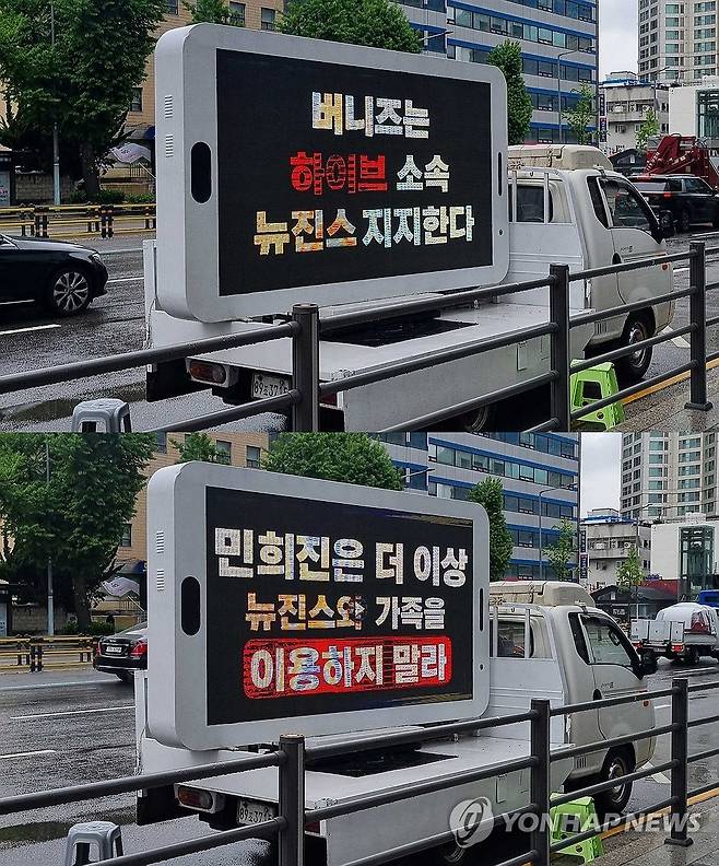 (서울=연합뉴스) 24일 서울 용산구 하이브 사옥 앞 뉴진스 팬들이 보낸 시위 트럭이 자리하고 있다. 2024.4.24 [독자 제공. 재판매 및 DB 금지]