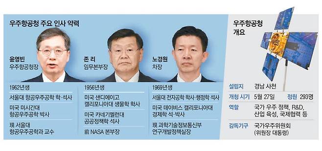윤석열 대통령이 다음달 출범하는 우주항공청의 초대 수장으로 윤영빈 서울대 교수를 낙점했다. 또 임무본부장으로는 존 리 전 미국 항공우주국(NASA·나사) 본부장을 내정했다. 이로써 윤 대통령의 대선 공약이었던 우주항공청을 이끌 진용이 갖춰졌다.
