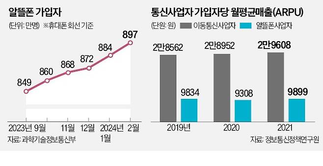 알뜰폰은 전체 통신 가입자의 19.2%를 차지할 정도로 규모가 커졌다. 저렴한 요금제를 무기로 앞세우고 있다. 하지만 정부가 가계 통신비 인하를 위해 통신 3사에 저가 요금제 출시를 압박하면서 알뜰폰의 입지가 좁아지고 있다. 통신 3사는 지난해 중간 요금제를 내놓은 데 이어 올해 3만원대 5세대(5G) 이동통신 요금제를 선보였다. 정부는 최대 50만원에 이르는 전환 지원금 제도도 도입해 통신사 간 경쟁을 유도하고 있다. 신규 통신사업자로 선정된 스테이지엑스 역시 통신 3사보다 저렴한 요금제를 예고했다.