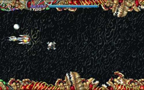 검떠 : 정말 게임 내내 그로테스크합니다. 정말 사람뱃속이 이렇게 생겼다고요? 그렇다면 생물공부를 다시 해야겠군요... 과연 알타입 제작사답게 미려하게 생긴 디자인의 주인공 기체는 전체 폭탄 및 특수 공격, 하다못해 알타입에도 있었던 옵션 하나 없이 단신으로 적들과 싸우게 되는데 유일한 파워업으로 기체의 촉수 같은 게 설치가 돼서 기체의 움직임에 역방향으로 특수를 움직일 수 있죠.