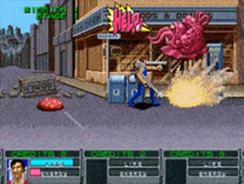 검떠 : 마지막으로 달리면서 강제로 스크롤되는 경우는 스크롤 슈팅 게임처럼 달려가면서 원거리 샷을 이용해서 앞서 달리는 외계인들을 쏴야 합니다. 적으로 등장하는 외계인들의 외형은 세가에서 제작한 '에일리언 신드롬'에 등장하는 기괴한 생명체들을 연상케 하는 디자인으로 마치 슬라임처럼 땅을 기어 다니며 인간 세상에 각종 사물로 위장을 하고 있거나 인간의 모습을 하고 달려오다가 갑자기 촉수가 달린 괴물의 형태로 변화하게 되죠.
