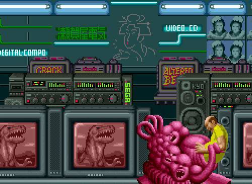 그 밖에도 수많은 핏덩이가 연상되는 이 스테이지 보스 라든가 알 수 없는 벌레 같은 걸 토해내며 눈알같은 걸 돌리며 서서히 다가오는 보스, 마치 두더지 게임처럼 바닥 구멍 속에서 기어 올라오는 보스, 사람의 얼굴과 팔다리 등이 마구 뒤섞여 있는 듯한 보스인 체로 머리 통에 달팽이관이 양쪽으로 달려있는 보스 등 정말 디자이너가 무슨 생각으로 만들었는지 알 수 없을 정도로 기괴한 보스들이 등장합니다. ^^