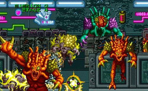 또 스테이지 초반 부터 등장하는 징그러운 느낌의 그래픽으로 그려진 생물 내장 속 조직을 연상케 하는 빨갛고 울퉁불퉁한 배경은 이곳이 우주가 아니라 어떤 생물의 뱃속에 들어와 있는 게 아닌가 싶었죠.