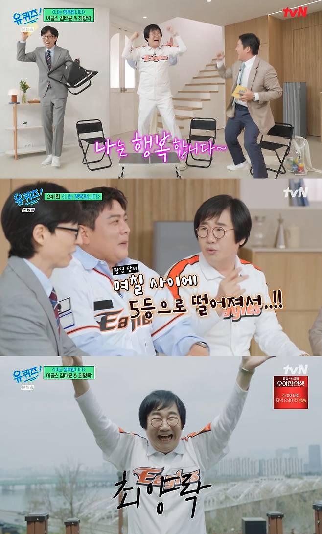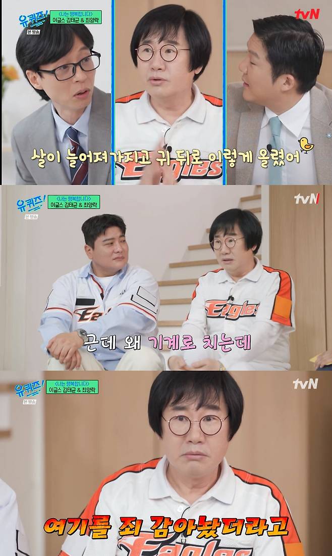 최양락은 "'유퀴즈' 섭외 전화 받았을 때가 1위였다. 그런데 통화 끝난 이후부터 계속 지는 거다. 지금은 5위가 됐다"라고 돌직구를 날렸다. 그는 '너무 아깝게 졌다'는 작가의 말에 '늘 그래왔다. 7연승이 이상했던 거다'라고 답해 웃음을 자아냈다. 김태균은 "비가 와서 그렇다. 우천으로 경기가 취소 되면서 좋았던 흐름이 딱 (끊겼다)"라고 아쉬워 했다.