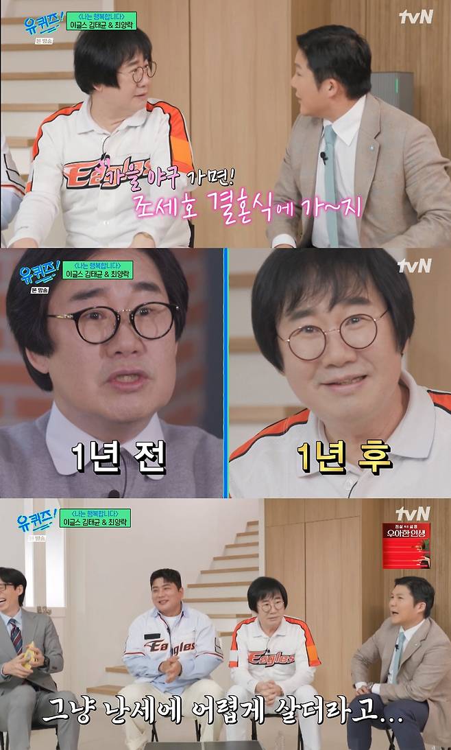 또한 김태균 선수는 실력 능력에 비해 아쉬움이 많았다. 최양락은 "김태균 선수가 현역 시절에 '이대호와 비교해도 전혀 손색이 없다'라 생각한다. 근데 이글스가 최하위권이라서 티가 안났다"라며 "'난세에 영웅이 난다'고 영웅이 될 줄 알았는데 난세에 그냥 어렵게 살더라"라고 담담하게 말했다.