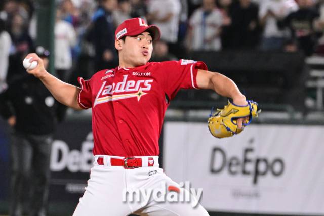 [마이데일리 = 부산 곽경훈 기자] 24일 부산 사직야구장에서 진행된 '2024 신한 SOL 뱅크 KBO 리그' SSG-롯데의 경기. SSG 조병현이 8회말 구원 등판해 역투를 펼치고 있다.