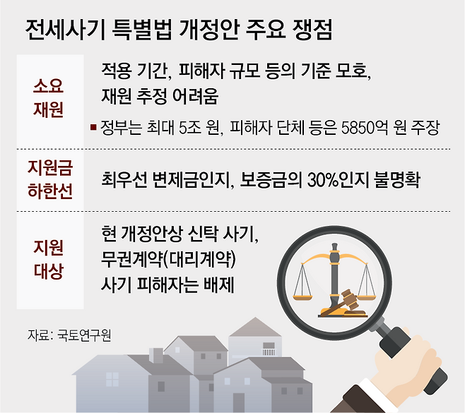 전세사기 피해자에 대한 '선(先)구제 후(後)구상'을 핵심 내용으로 하는 전세사기 피해지원 특별법 개정안이 국회 본회의 표결을 앞둔 상황에서 소요 재원과 지원 금액, 지원 대상을 놓고 논란이 불거지고 있다.
