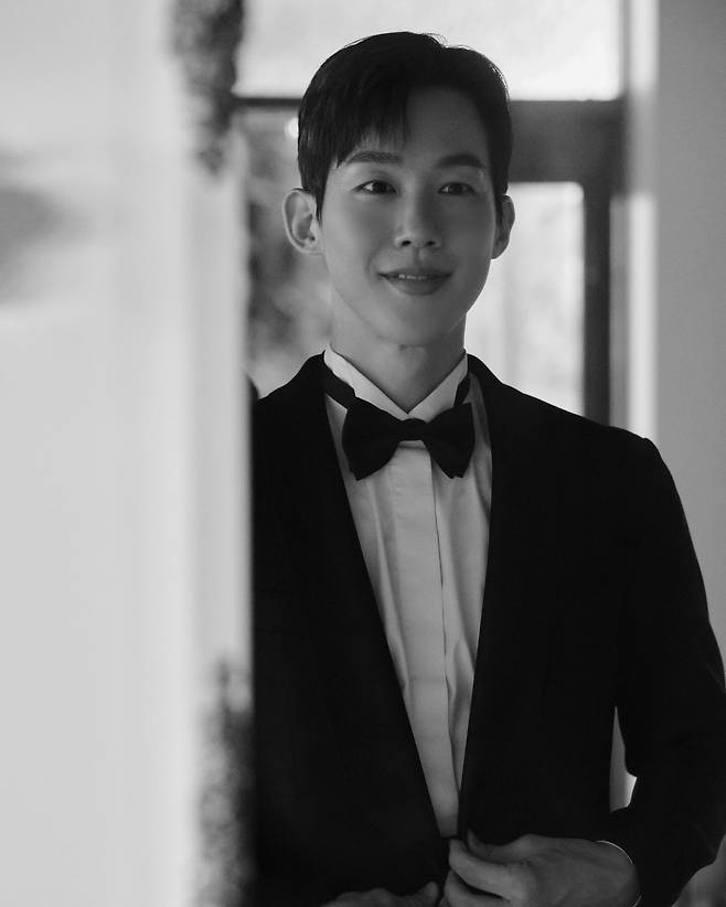 공개된 사진 속 이재성 아나운서는 턱시도 차림으로 서서 포즈를 취하고 있다.