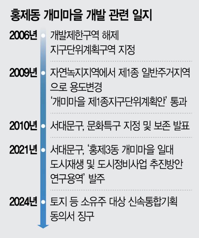 개발의 불씨는 2021년 되살아났다. 서대문구는 ‘홍제3동 개미마을 일대 도시재생 및 도시정비사업 추진방안 연구용역’을 발주하며 다시 개발 검토에 나섰다. 서대문구 관계자는 “2021년 국토부에서 신규도입한 주거재생혁신지구 공모에 신청하기 위해 용역을 진행했으나 이후 서울시의 신속통합기획을 통해 개발하는 것이 더욱 유리하다고 판단했다”며 “구에서 먼저 검토를 했고 주민들도 신통기획을 더 선호해 최근에 동의서를 교부한 것”이라고 설명했다.