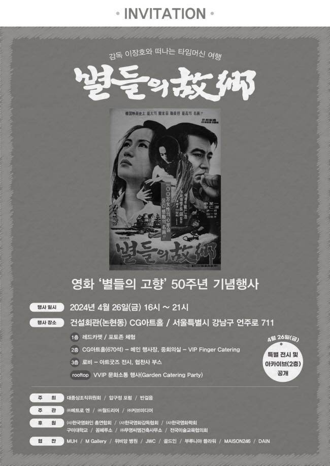 압구정 포럼, 대종상조직위원회 등이 주최하는 이번 행사에서는 영화 '별들의 고향' 개봉일 50주년에 맞춰 진행하는 것으로, 이 감독 영화에 대한 특별 전시 및 아카이브를 공개할 예정이다.