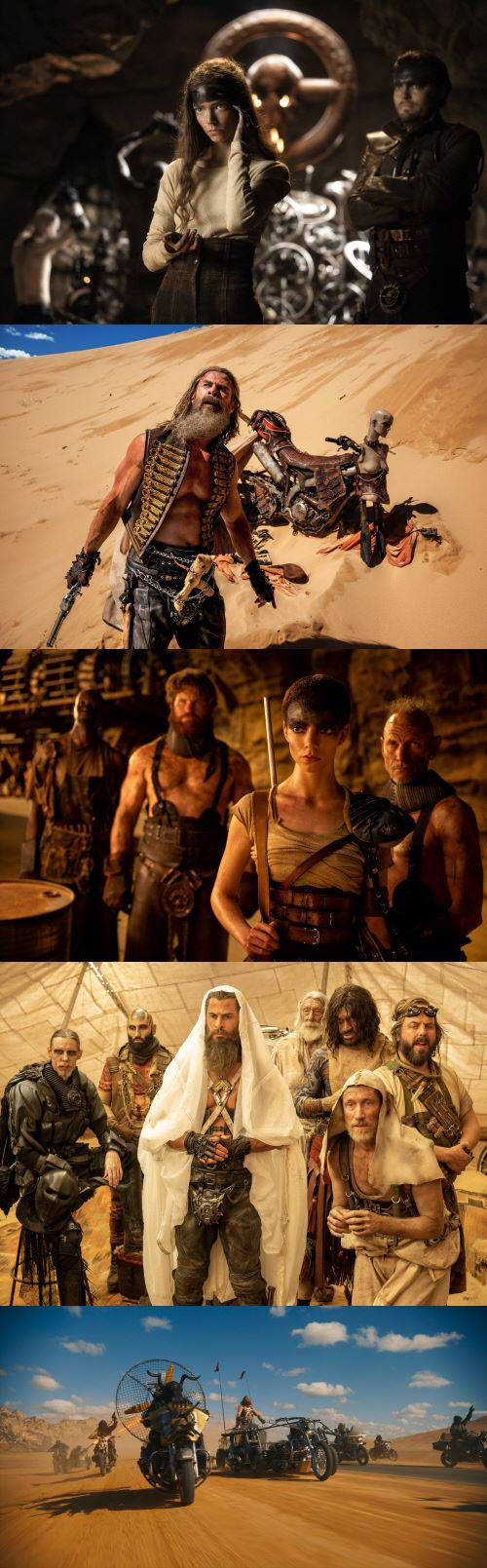 공개된 스틸은 붕괴된 세상에도 풍요를 잃지 않았던 ‘녹색의 땅’에서 살아가던 어린 퓨리오사(안야 테일러 조이 분)가 한순간에 모든 것을 앗아간 원흉 디멘투스(크리스 헴스워스 분)를 향한 복수의 여정을 시작할 것임을 알려 기대를 증폭시킨다. 마치 신성한 성인이라도 된 듯 머리에 흰색 천을 쓴 디멘투스와 거침없이 황무지를 질주하는 바이크 군단의 모습은 ‘매드맥스’ 세계관 속 우리가 알지 못했던 또 다른 세력의 등장과 이들이 어떤 힘을 가지고 있는지, 무엇을 목적으로 퓨리오사를 납치한 것인지 궁금증을 자극한다. 더불어 생존과 복수를 위해 머리카락마저 짧게 자르고 전사로 각성하기까지 퓨리오사의 서사 또한 빠져들 수밖에 없는 몰입감으로 전개될 예정이다. 여기에 퓨리오사의 강렬한 눈빛과 모래사막 위 홀로 남겨진 ‘디멘투스’의 당황스러운 표정이 대비되면서 두 사람의 폭발적인 대립이 과연 ‘매드맥스’ 시리즈 특유의 질주 액션과 함께 어떻게 펼쳐질 것인지 기대감을 최고로 자극하고 있다.