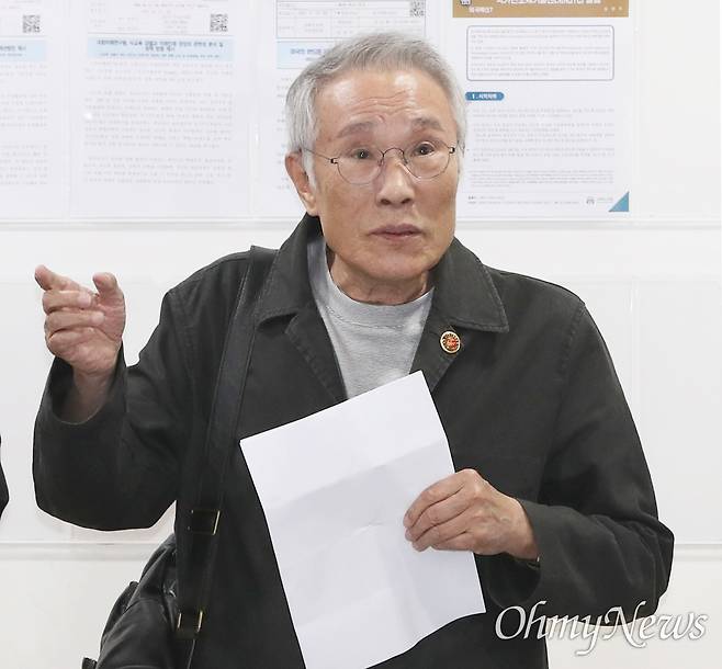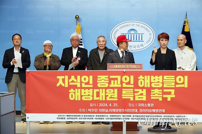 해병대원 순직사건 수사외압 의혹의 진상을 규명할, 이른바 '채상병 특검법(아래 특검법)' 처리를 촉구하는 해병대 출신 지식인·종교인 성명 발표 자리에서다. 해병대 배지를 옷깃에 단 그의 곁에는 해병대 출신 이진 기장 선민교회 담임목사, 김영 인하대 명예교수, 김경일 신부, 진우 스님 등이 함께 자리했다.