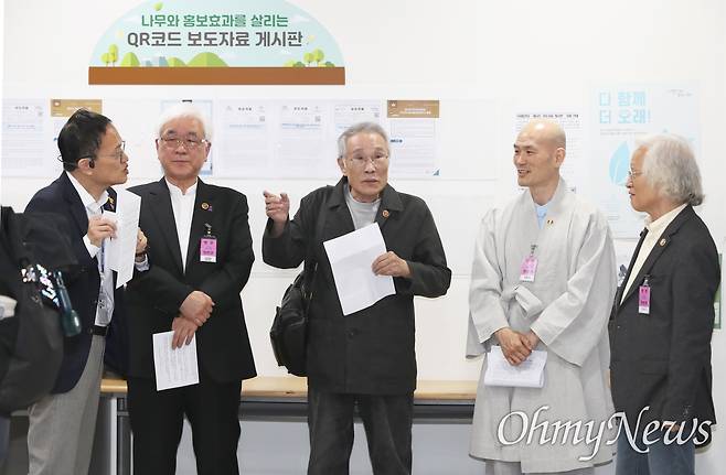 | ▲ 해병대원 순직사건 특검 촉구 해병 출신 지식인 종교인 성명 발표 이진 기장 선민교회 담임목사, 황석영 작가, 진우 스님, 김영 인하대 명예교수가 25일 오전 서울 여의도 국회 소통관에서 해병대원 순직사건 특검 촉구 해병 출신 지식인 종교인 성명을 발표하기 앞서 대화하고 있다. 맨 왼쪽은 박주민 더불어민주당 의원. |