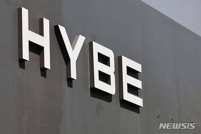 [서울=뉴시스] 김금보 기자 = 기획사 하이브와 그룹 '뉴진스' 소속 자회사 어도어의 민희진 대표가 충돌하며 논란이 일고 있다. 사진은 25일 서울 용산구 하이브 사옥. 2024.04.25. kgb@newsis.com