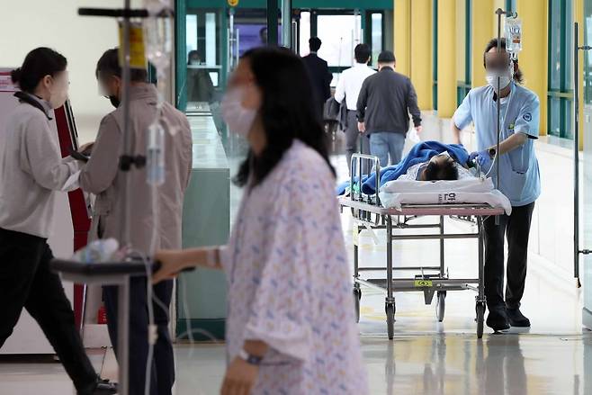 의대 교수들의 사직이 현실화된 가운데 25일 서울 시내의 한 대형병원에서 환자들이 이동하고 있다.