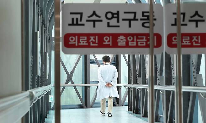 '빅5' 병원을 포함한 전국 의대 교수들의 사직이 현실화된 가운데 25일 서울 시내의 한 대형병원에서 의료진이 이동하고 있다.