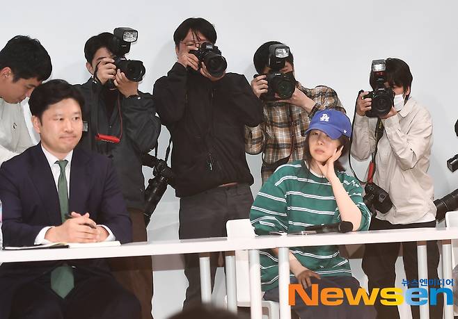 4월 25일 오후 하이브 경영권 탈취 의혹과 관련 걸그룹 뉴진스 소속사 어도어의 공식 입장을 발표하는 긴급 기자회견이 서울 한국컨퍼런스센터에서 열렸다.