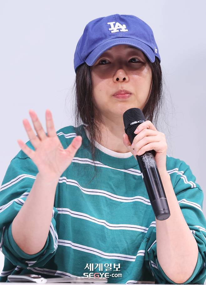 어도어의 민희진 대표가 25일 오후 서울 강남구 한국컨퍼런스센터에서 열린 경영권 탈취 의혹과 관련한 기자회견에 참석해 입장을 밝히고 있다.