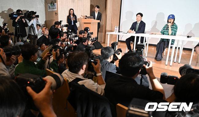 [OSEN=조은정 기자]하이브 산하 레이블 어도어의 대표 민희진이 25일 오후 서울 서초구 한국컨퍼런스센터에서 경영원 탈취 시도 의혹 관련 긴급기자회견을 열었다.