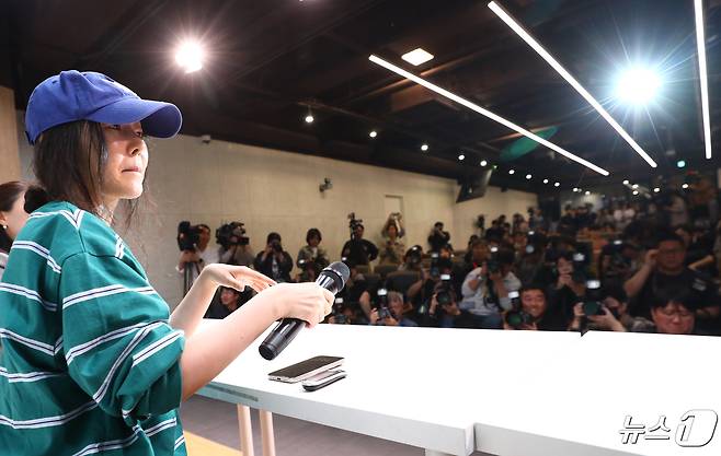 (서울=뉴스1) 권현진 기자 = 그룹 뉴진스의 소속사 어도어 민희진 대표가 25일 서울 서초구 한국컨퍼런스센터에서 하이브 경영권 탈취 시도와 관련한 배임 의혹 관련 입장을 밝히는 긴급기자회견을 열고 마이크를 들고 있다. 2024.4.25/뉴스1