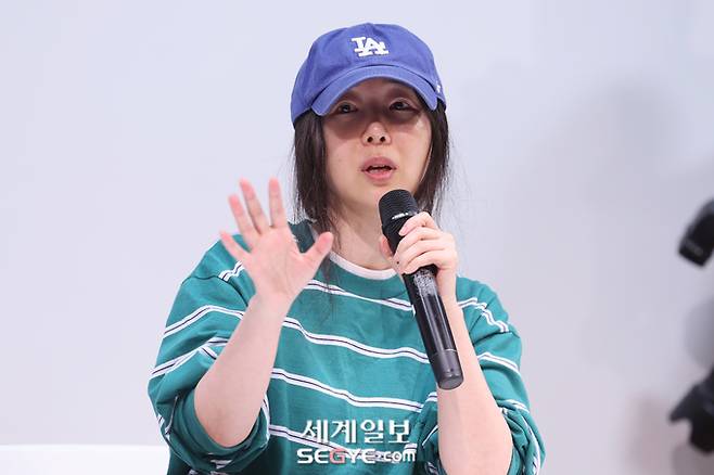 어도어의 민희진 대표가 25일 오후 서울 강남구 한국컨퍼런스센터에서 열린 경영권 탈취 의혹과 관련한 기자회견에 참석해 입장을 밝히고 있다.