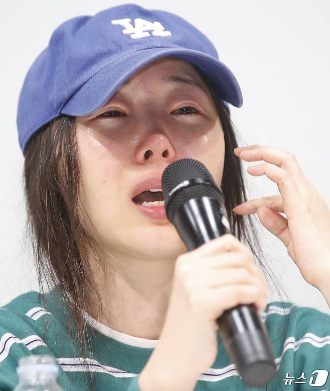 (서울=뉴스1) 권현진 기자 = 그룹 뉴진스의 소속사 어도어 민희진 대표가 25일 서울 서초구 한국컨퍼런스센터에서 하이브 경영권 탈취 시도와 관련한 배임 의혹에 긴급기자회견을 갖고 눈물을 흘리며 입장을 밝히고 있다. 2024.4.25/뉴스1