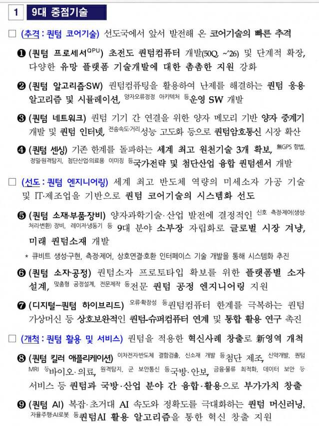 첫째, 축적한 우리 과학기술과 ICT 역량을 기반으로 선도국들을 빠르게 추격해야 할 퀀텀 핵심(코어)기술 역량을 강화한다. 양자컴퓨터 기반이 되는 ❶퀀텀 프로세서(QPU), 산업적․학문적 난제를 해결하기 위한 ❷퀀텀 알고리즘‧소프트웨어(SW), 양자 기기 간 연결을 위한 퀀텀 인터넷, 도청과 감청이 불가능한 차세대 퀀텀암호통신 등 ❸퀀텀 네트워크, 無 GPS 항법용 센싱, 초고해상도 이미징 등 ❹퀀텀 센싱 핵심기술을 적극적으로 확보해 나간다.