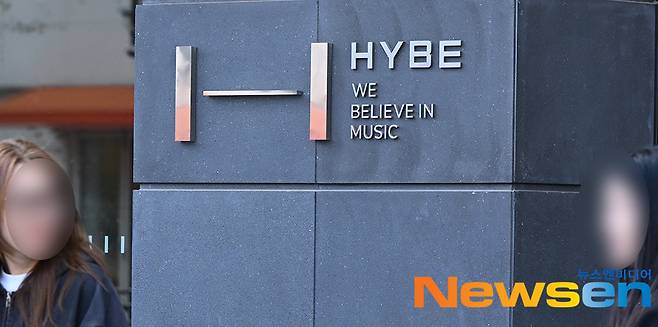 하이브와 어도어 민희진 대표간의 충돌로 논란이 커진 가운데 4월 25일 서울 용산구에 위치한 하이브 사옥의 모습.