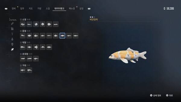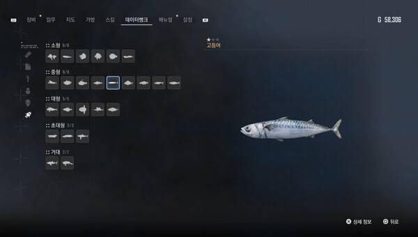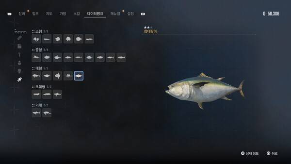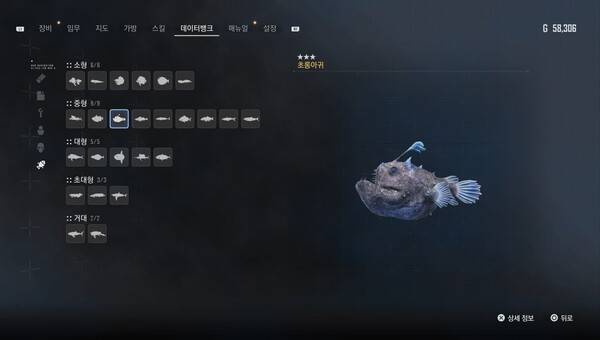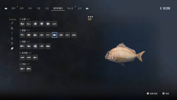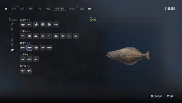 크기는 총 5종류다. 상위 물고기는 그에 맞는 미끼를 사용해야 한다. 예를 들어 할리벗은 '꿈틀거리는 벌레'로 낚을 수 없다. 반드시 생선 조각을 사용해야 한다. 반대로 생선 조각을 사용한다고 반드시 대형 어류가 잡히는 것은 아니다. 소~중형 어류도 잡힌다.