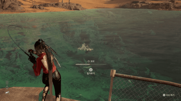 캐스팅이 완료되면 물고기가 미끼를 물 것이다. 미끼를 물지 않을 경우 종료했다가 다시 캐스팅을 진행한다. 물고기가 미끼를 물면 R2 키를 클릭해 힘겨루기 페이즈로 넘어간다.