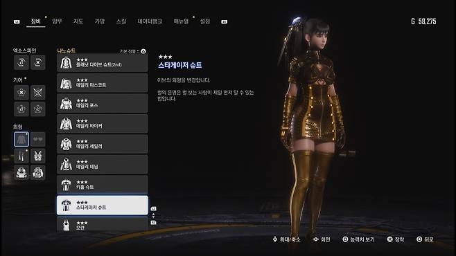 스텔라 블레이드에는 기본적으로 나노슈트 39종(1회차 보상, 디럭스 에디션 보상 포함)이 존재한다.