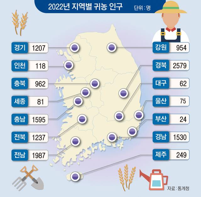 2022년 청년 귀농 인구는 1195명으로 전체 귀농 인구의 9.4%를 차지했다. 청년 귀농인 역시 전남(291명)과 경북(243명)을 선택한 경우가 많았다. 기초지자체 가운데는 경북 상주(27명)와 김천(22명)으로 향한 청년이 많았다.