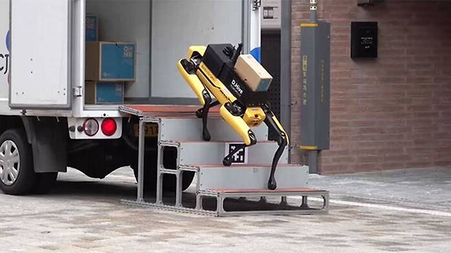 로봇개 등에 있는 적재함에 택배 상자를 올려놓자 로봇개는 몸의 방향을 틀어 택배 차량에서 계단을 밟고 내려왔습니다.