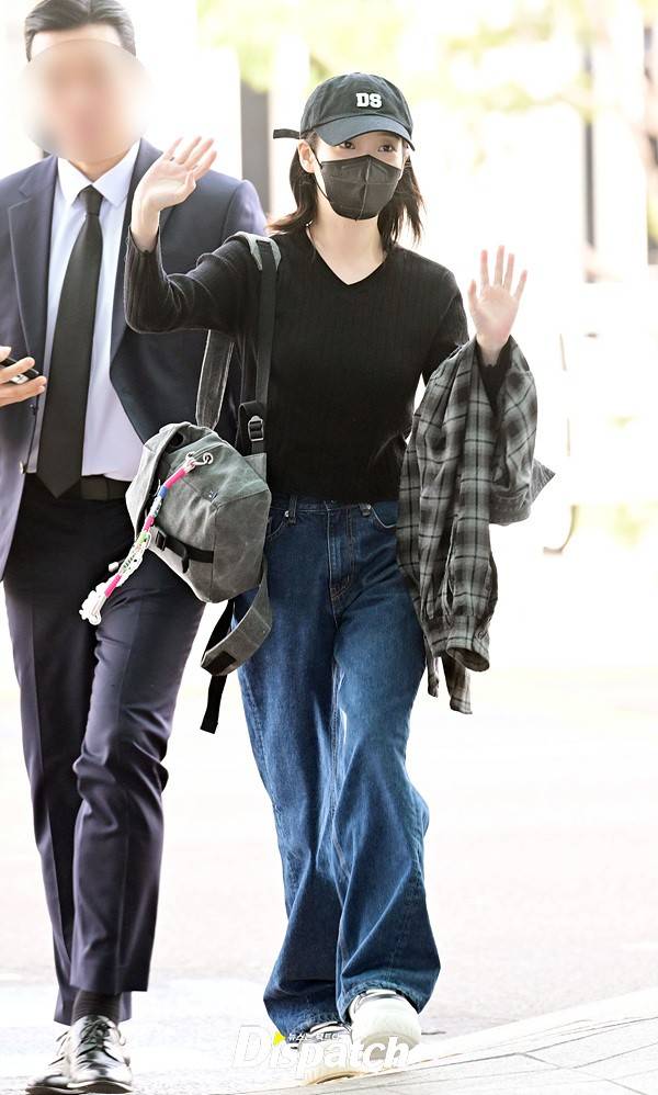 아이유는 모자와 마스크에도 러블리한 비주얼로 시선을 모았다. 공항에 모인 팬들을 위해 손인사로 화답했다.