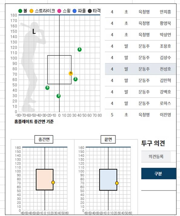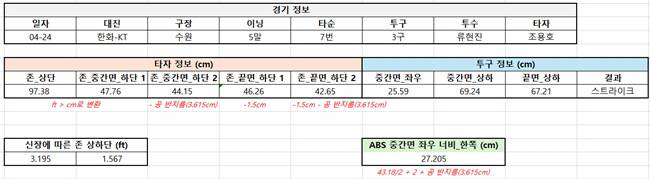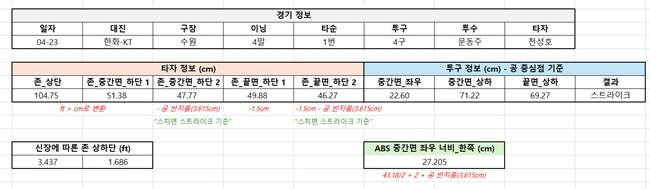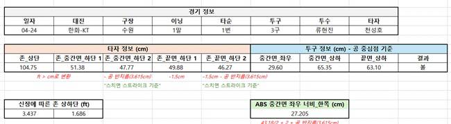 이어 "류현진 선수가 등판한 해당 경기 3회말 KT 조용호 선수의 타석 3구째는 ABS 중간 존 하단을 0.15cm위로 통과했으나 ABS 끝면 존 하단을 0.78cm 차이로 통과하지 못해서 볼 판정을 받았습니다. 그리고 5회말 조용호 선수의 타석 3구와 3회말 3구를 비교해서 확인하실 수 있도록 해당 투구 데이터도 첨부했습니다. 또한 23일 문동주 선수가 투구한 4회말 KT 천성호 선수 타석의 4구(스트라이크 판정), 24일 류현진 선수가 투구한 1회말 KT 천성호 선수 타석의 3구(볼 판정)는 그래픽에서 확인하실 수 있는 것처럼 투구된 위치가 다릅니다" 설명했다.