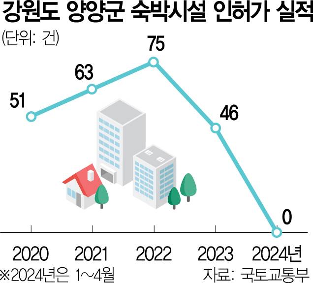 초대형 리조트가 아닌 호텔이나 생활형숙박시설 등도 사정은 마찬가지다. 강원도 양양군 숙박시설 인허가 실적은 △2020년 51건 △2021년 63건 △2022년 75건으로 꾸준히 증가했다. 하지만 지난해 46건으로 감소한 후 올해 들어 지금까지 한 건도 없는 상태다.