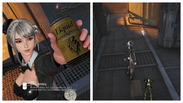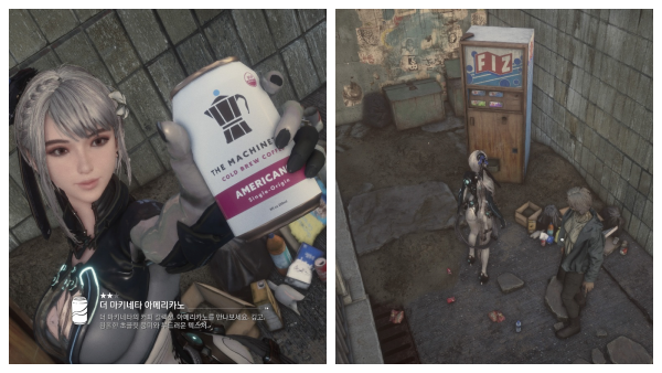- 타워 외벽(타워 밖에서 드론 밟고 지나가기) 통과 후 기계 군체(흰색 고정형 네이티브) 처치하고 우측 난간 따라 이동(자판기)