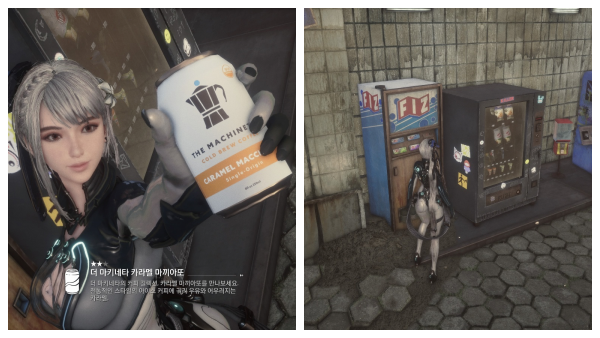 - 타워 외벽(타워 밖에서 드론 밟고 지나가기) 통과 후 기계 군체(흰색 고정형 네이티브) 처치하고 우측 난간 따라 이동(자판기)