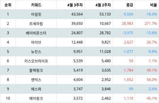 4월 4주차 걸그룹 랭키파이 분석 결과 1위를 차지한 아일릿은 트렌드 지수 43,564포인트로 전주보다 9,569포인트 하락했다.
