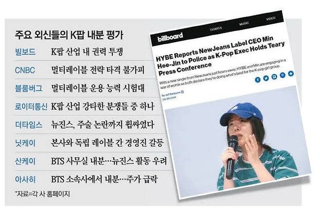 방탄소년단(BTS)을 키운 하이브와 뉴진스를 키운 하이브 산하 레이블 어도어 민희진 대표 사이에 불거진 극한 대립에 주요 외신들도 주목하고 있다. 외신들은 양측의 진실 공방보다 이번 사태를 촉발한 K팝 산업 특유의 구조적 배경에 집중하는 모습을 보였다.