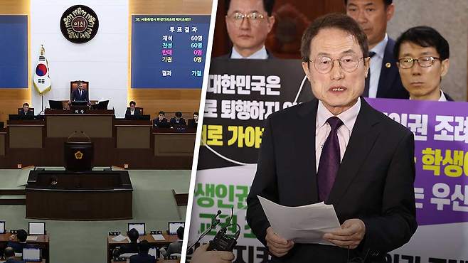 앞서 서울시의회는 오늘 제323회 임시회 제3차 본회의를 열고 '서울시 학생인권조례 폐지조례안'을 상정, 재석 의원 60명 전원의 찬성으로 통과시켰습니다.