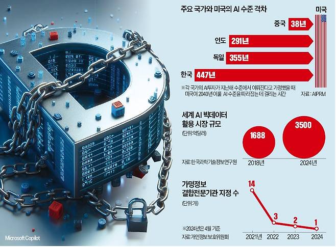 업계 관계자는 “개인정보를 캐내기 위해 가명정보를 재식별하는 시도는 과징금과 형사 처벌 등을 통해 막는 게 정석”이라며 “무조건 막기만 하면 AI 등의 분야에서 선진국을 따라잡기 힘들다”고 말했다. 미국 AI 개발업체 AIPRM에 따르면 한국과 미국의 AI 수준 격차는 447년이다. 미국이 2040년에 도달할 AI 기술 수준을 한국이 따라잡기까지 약 447년의 시간이 필요하다고 분석했다.